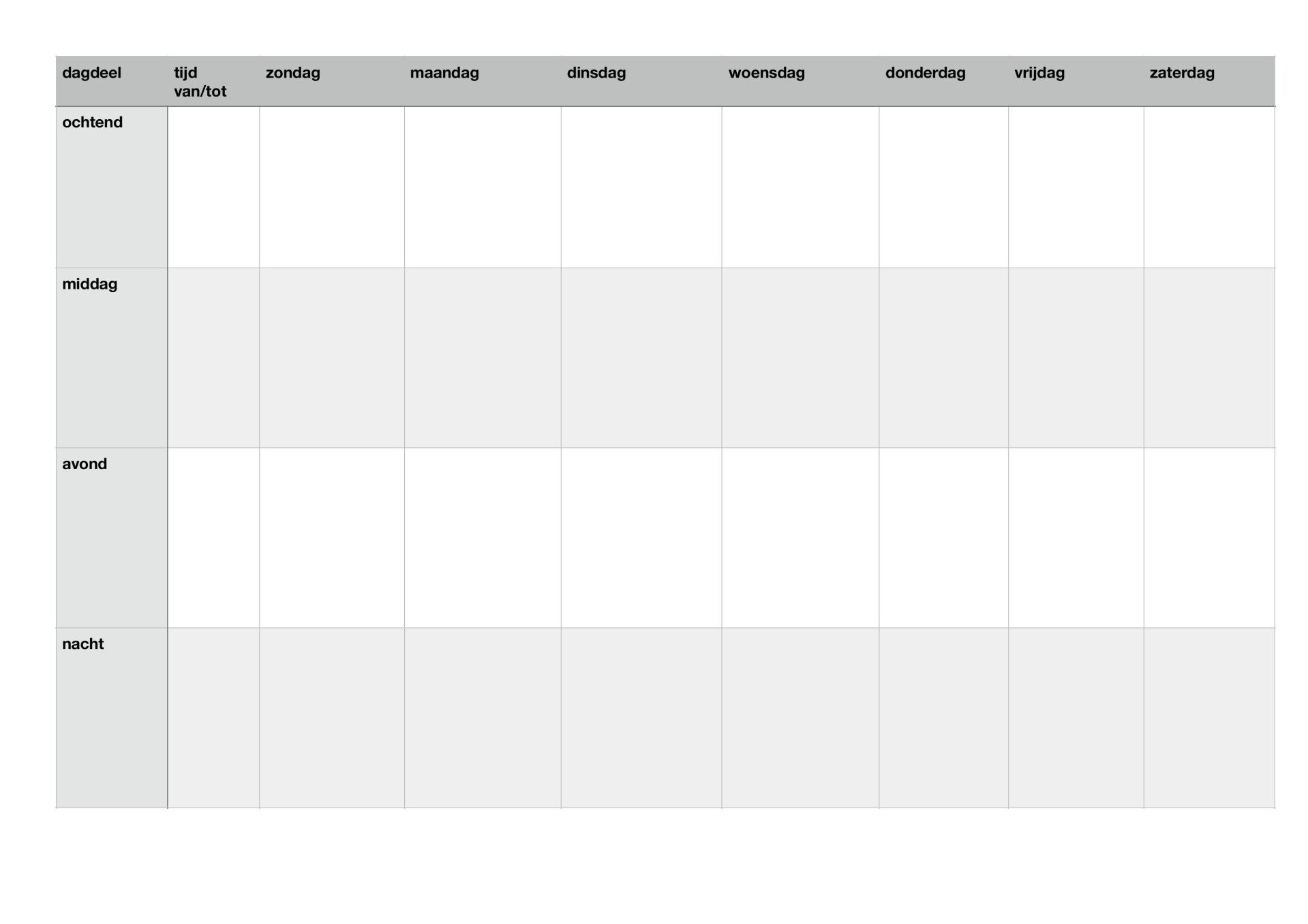 Vul het blokschema in en plan minimaal twee dagdelen per week voor stilte en reflectie. Denk vooral in blokken: plan soortgelijke activiteiten achter elkaar om te voorkomen dat je voortdurend moet schakelen. Bijvoorbeeld: